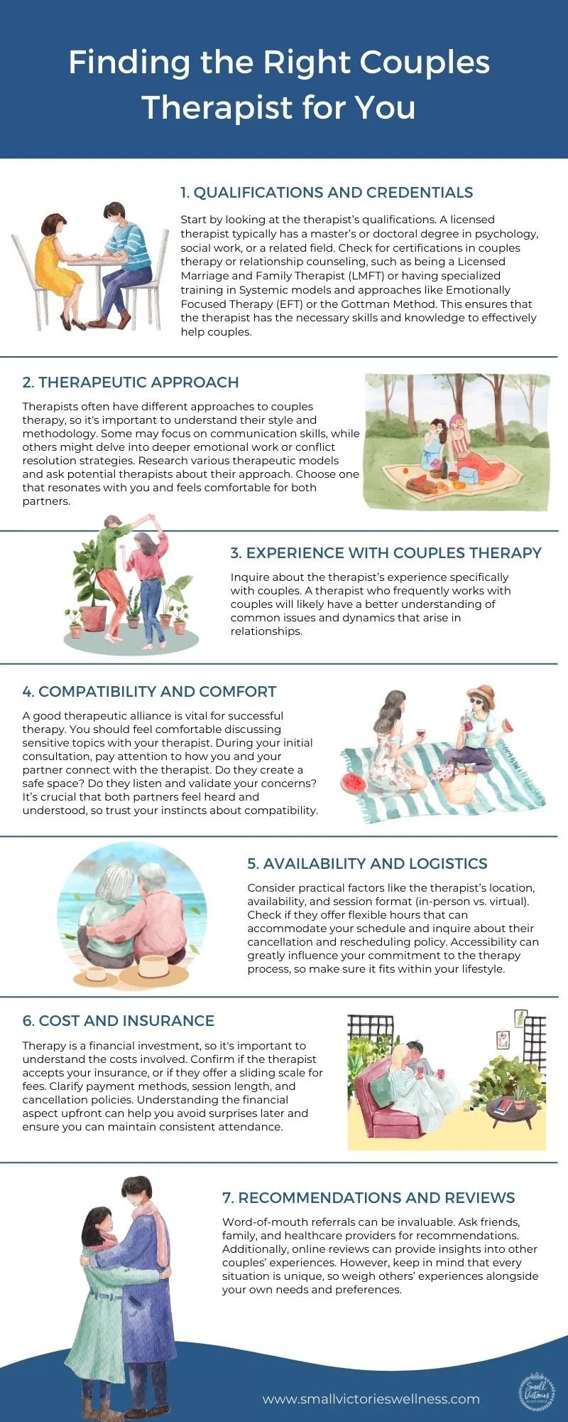 Making the decision to explore couples therapy can be a difficult yet crucial step in improving and evolving your relationship. A skilled therapist can guide you through challenges, enhance communication, and foster a deeper understanding between partners. However, not all therapists are created equal, and it’s important to connect one who aligns with your needs and values. Here are 7 key factors to consider when selecting the right couple’s therapist for you.